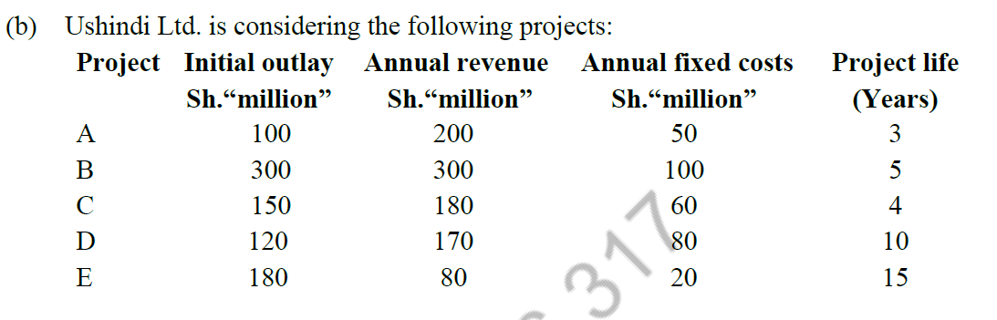 (c) Kangaro Youth Sports Ltd. wishes to design a new sports bicycle. The company will have to invest Sh.100 million at the beginning of the first year for the design and model testing of the new bicycle.