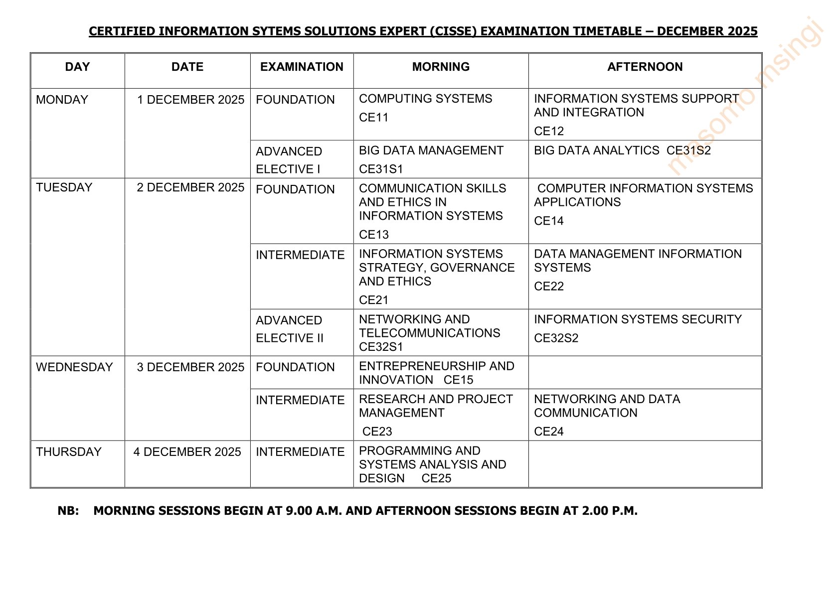 CERTIFIED INFORMATION SYTEMS SOLUTIONS EXPERT (CISSE) EXAMINATION TIMETABLE DECEMBER 2025 (Visited 105 times, 1 visits today)Share this:Share Written by MJ
