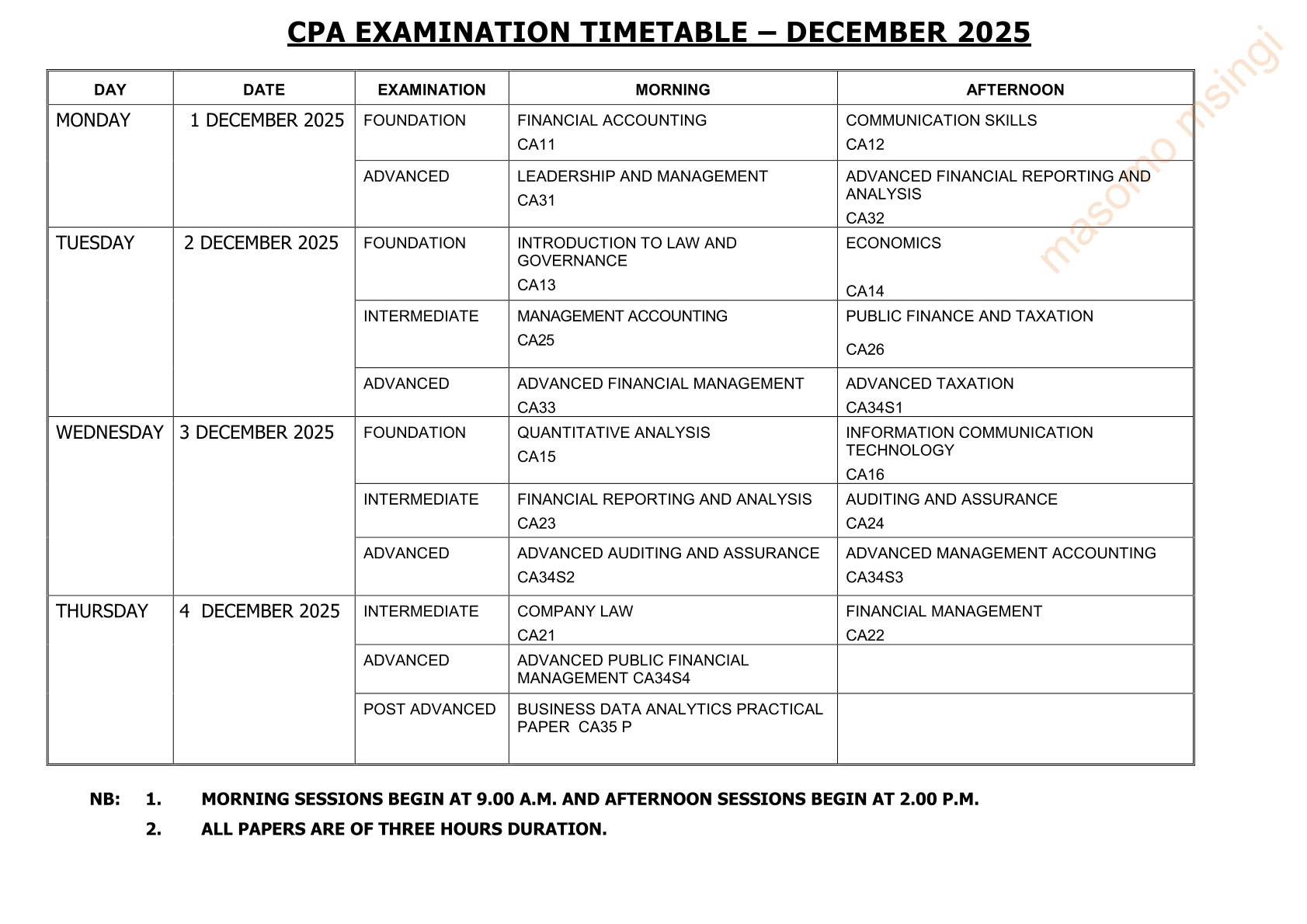 CPA EXAMINATION TIMETABLE DECEMBER 2025
