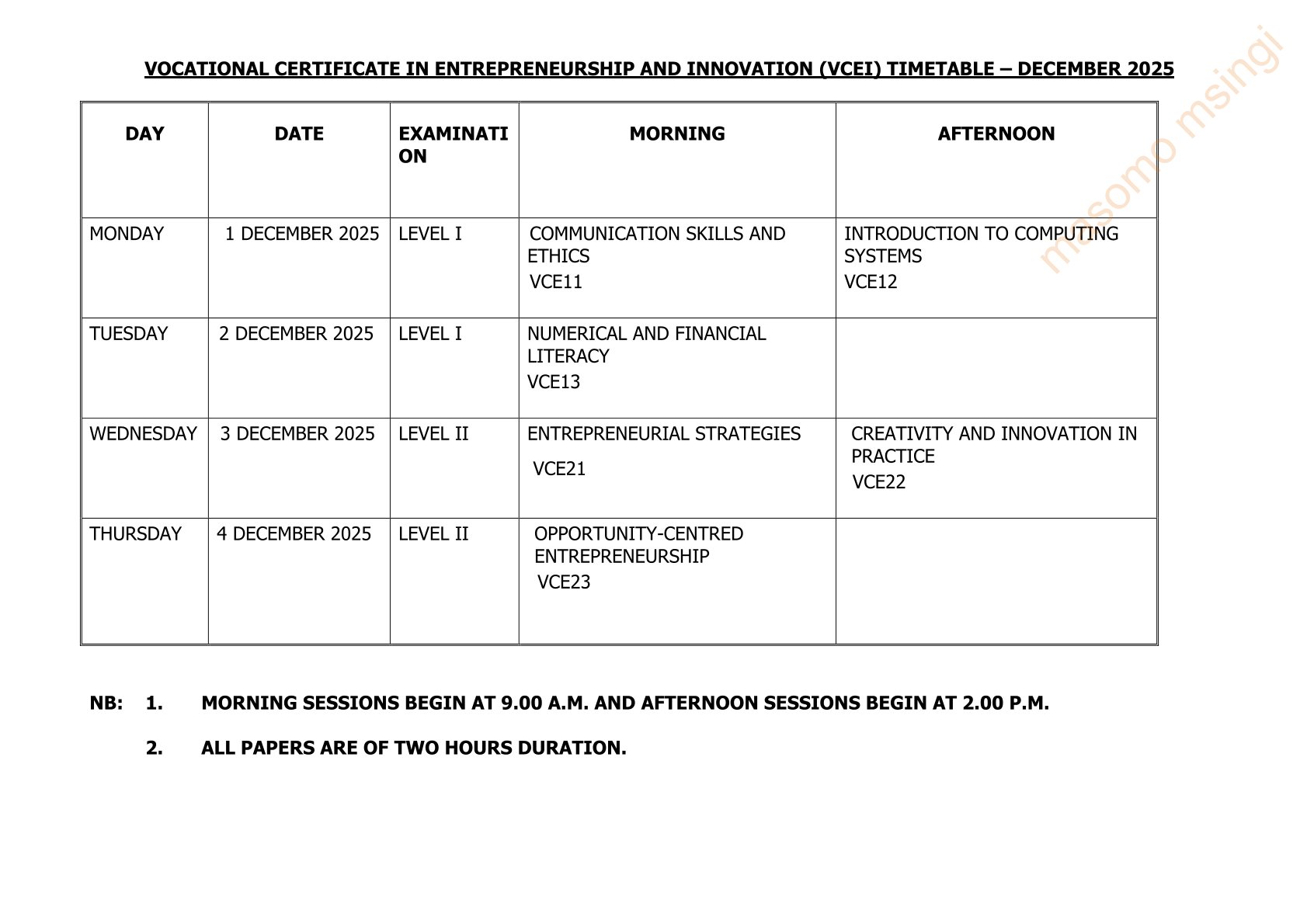VOCATIONAL CERTIFICATE IN ENTREPRENEURSHIP AND INNOVATION (VCEI) TIMETABLE DECEMBER 2025 (Visited 52 times, 1 visits today)Share this:Share Written by MJ