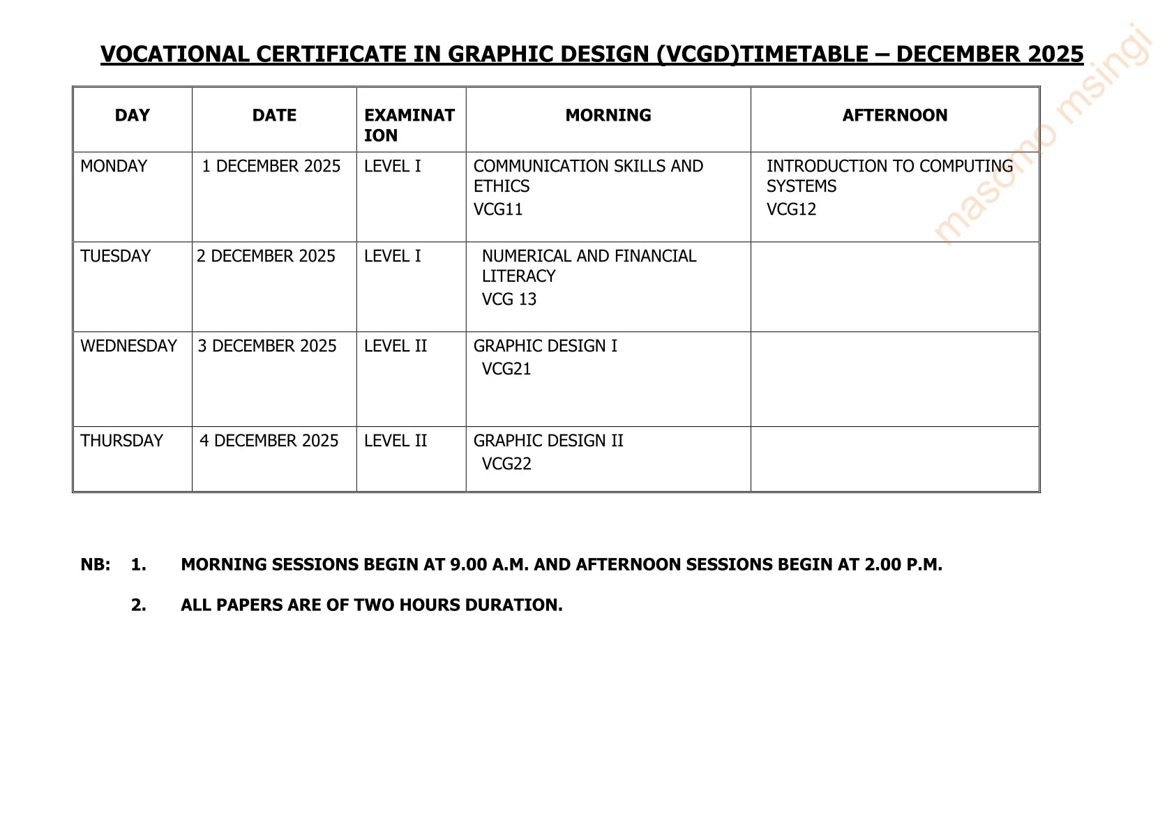 VOCATIONAL CERTIFICATE IN GRAPHIC DESIGN (VCGD)TIMETABLE DECEMBER 2025 (Visited 33 times, 1 visits today)Share this:Share Written by MJ